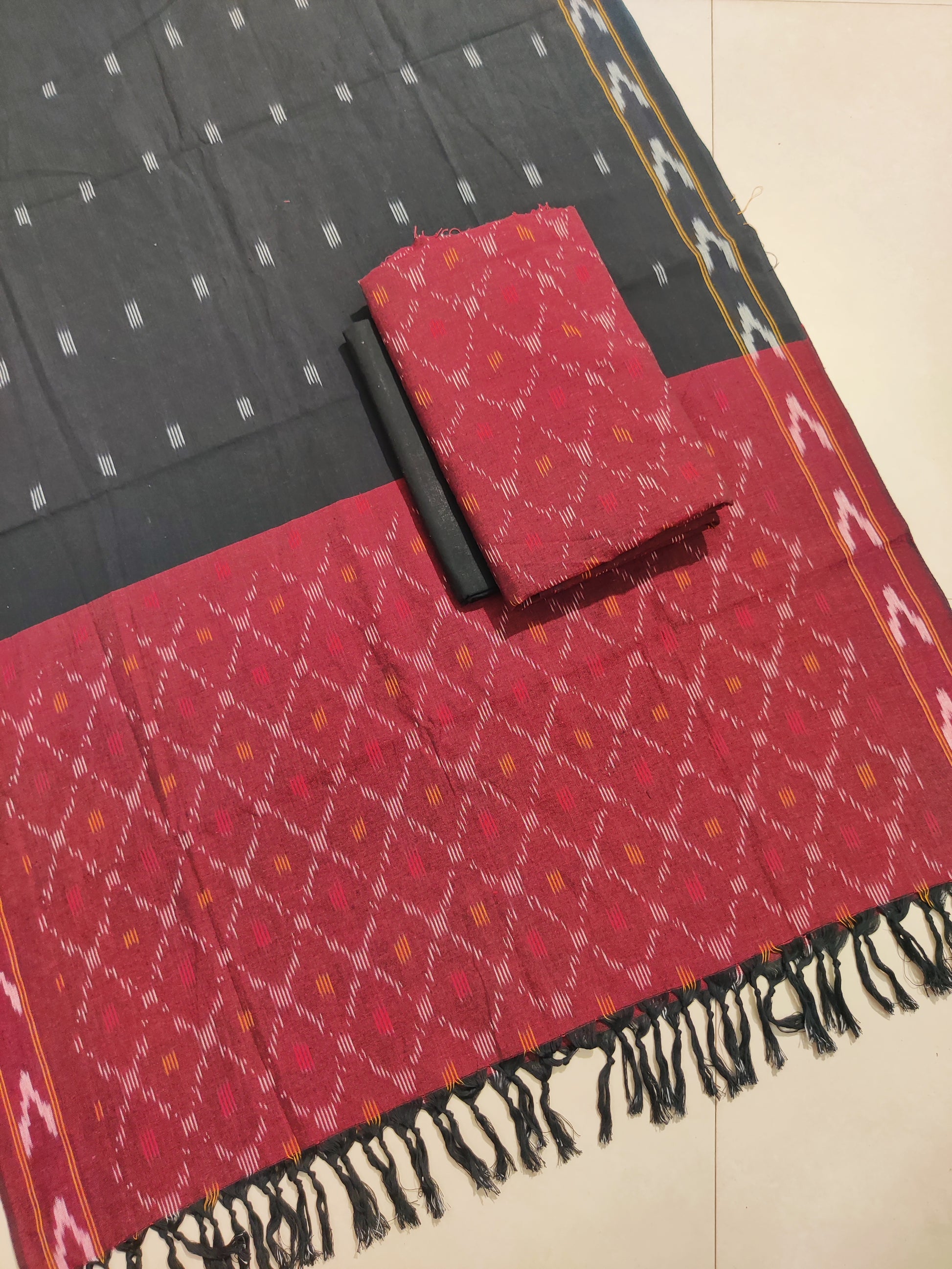 Celebrate traditional craftsmanship with this stunning 3-piece Pochampally Ikat cotton handloom dress material set from Telangana. The set includes: