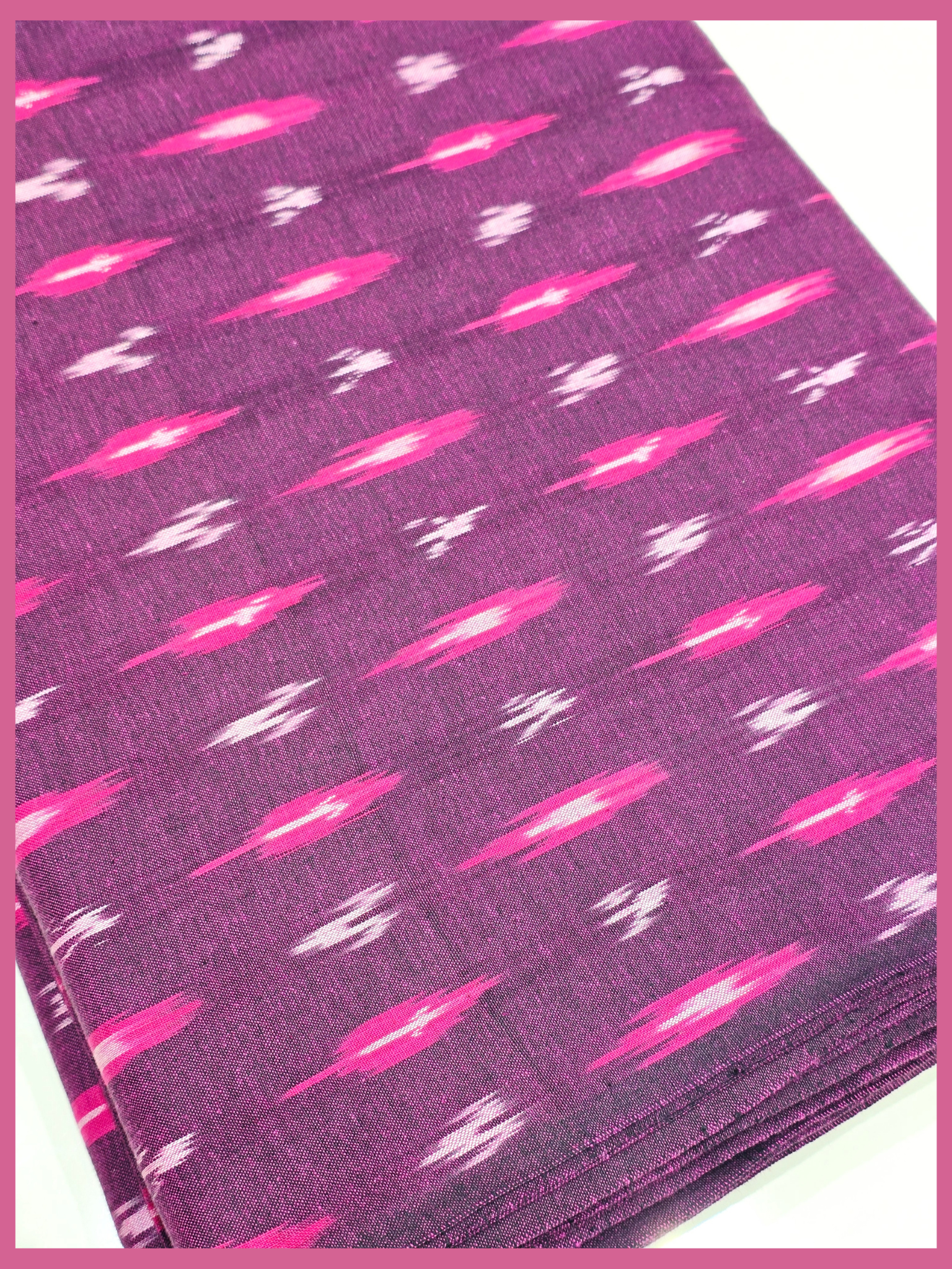 Pure cotton Pochampally Ikat fabric from Telangana, celebrated worldwide for its rich heritage and timeless craftsmanship. This fabric is created using the traditional Ikat resist-dye technique, where warp and weft yarns are meticulously dyed before weaving, resulting in distinctive patterns and vibrant character.
