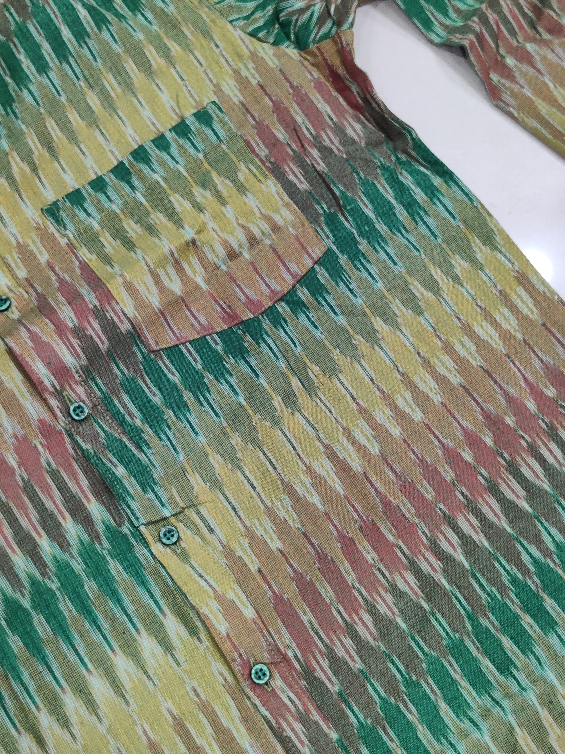 Handwoven in Telangana, this Pochampally Ikat shirt showcases vibrant geometric patterns created through the traditional resist-dyeing technique. Made from soft, breathable cotton, it offers lasting comfort and effortless style. Featuring wooden buttons and a classic patch pocket, this versatile shirt pairs perfectly with both casual and semi-formal looks — a true blend of tradition and modern charm.