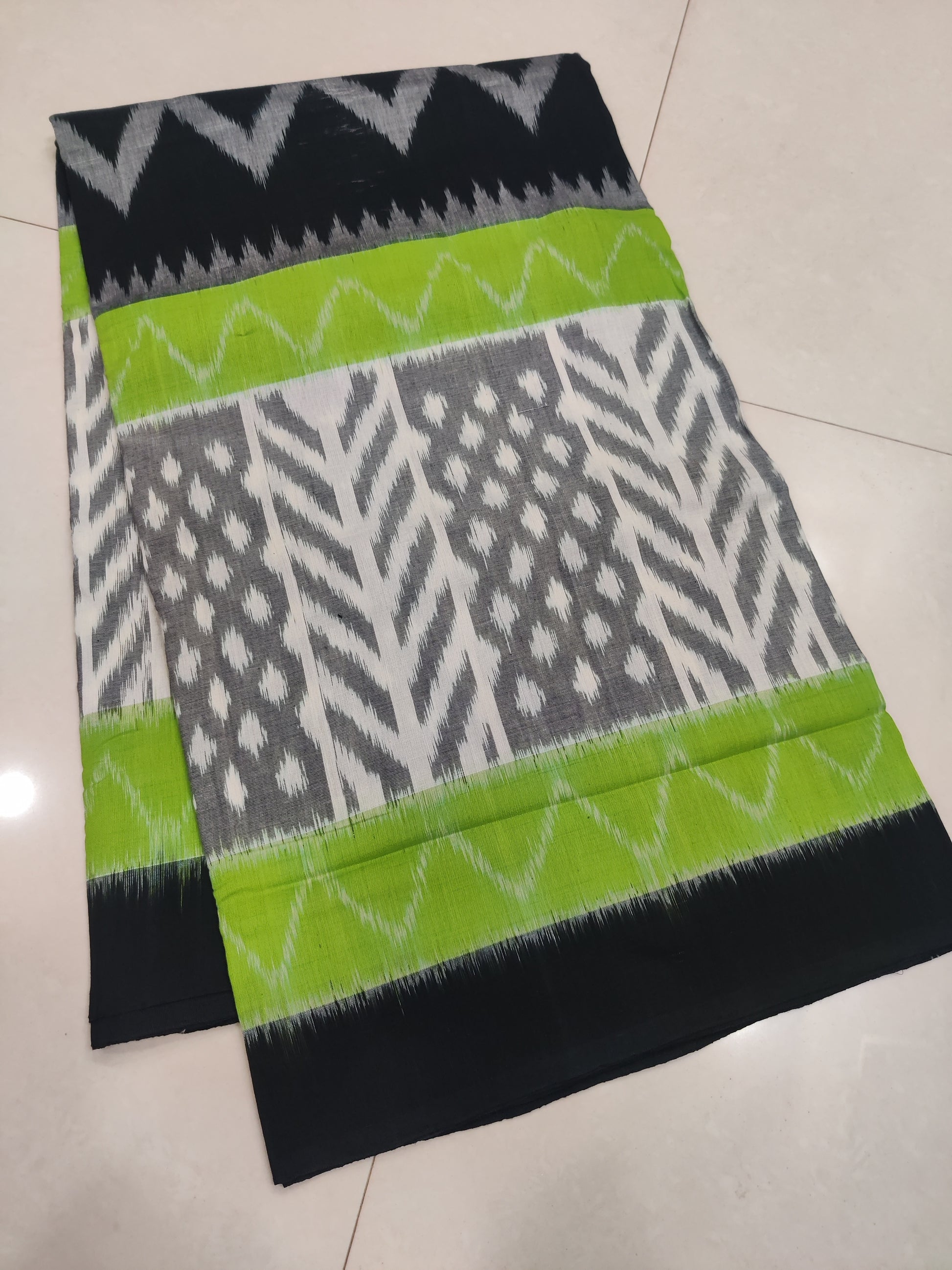 Each motif is crafted using the traditional resist-dyeing technique, where threads are meticulously tied and dyed before weaving — a process that demands patience, precision, and skill. The result is a saree that speaks of heritage, craftsmanship, and enduring beauty.