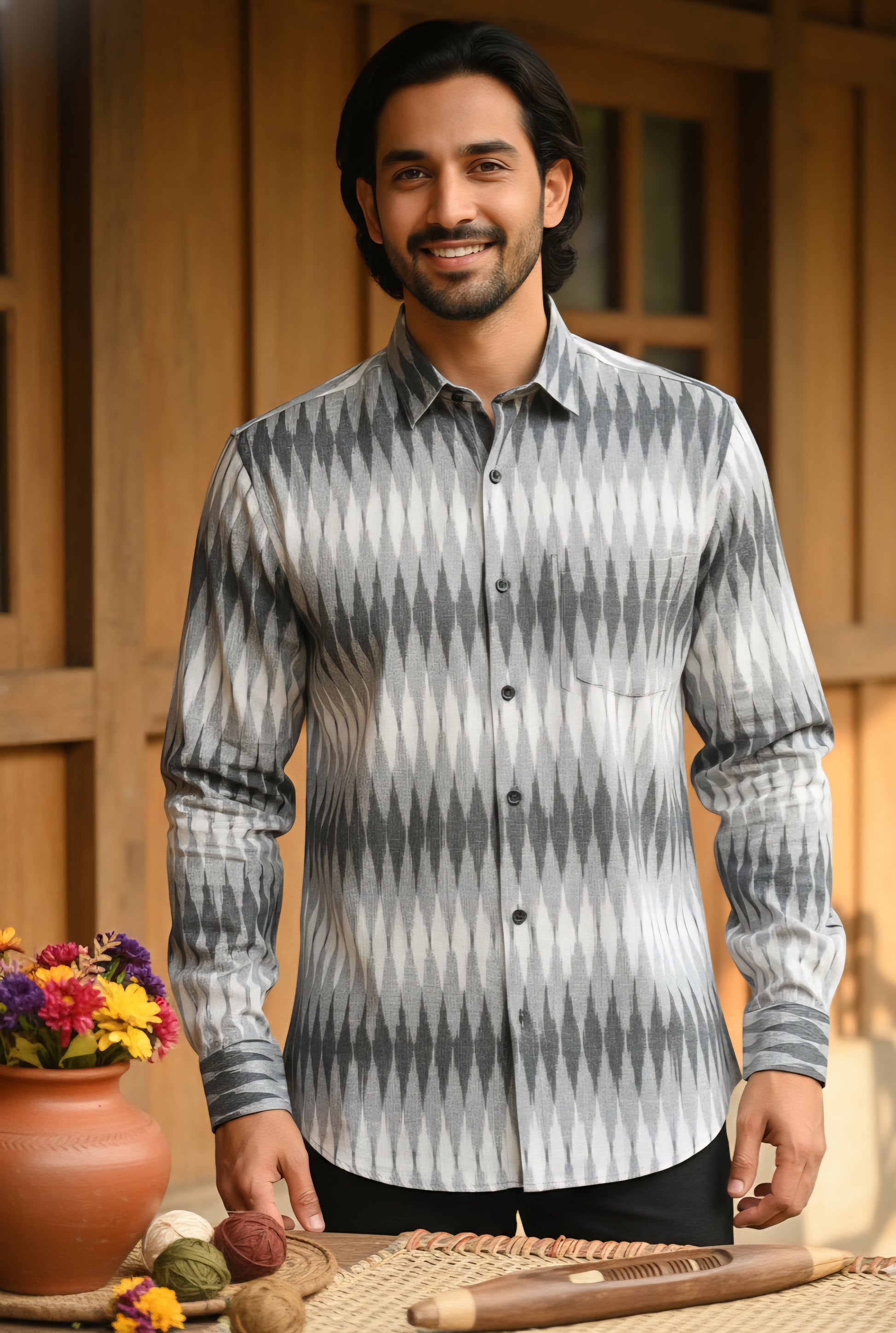 Handwoven in Telangana, this Pochampally Ikat shirt showcases vibrant geometric patterns created through the traditional resist-dyeing technique. Made from soft, breathable cotton, it offers lasting comfort and effortless style. Featuring wooden buttons and a classic patch pocket, this versatile shirt pairs perfectly with both casual and semi-formal looks — a true blend of tradition and modern charm.