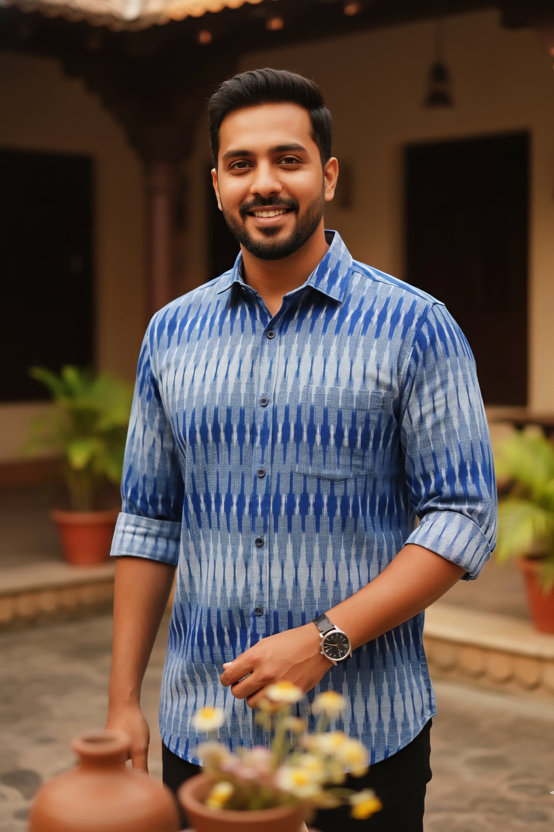 Handwoven in Telangana, this Pochampally Ikat shirt showcases vibrant geometric patterns created through the traditional resist-dyeing technique. Made from soft, breathable cotton, it offers lasting comfort and effortless style. Featuring wooden buttons and a classic patch pocket, this versatile shirt pairs perfectly with both casual and semi-formal looks — a true blend of tradition and modern charm.