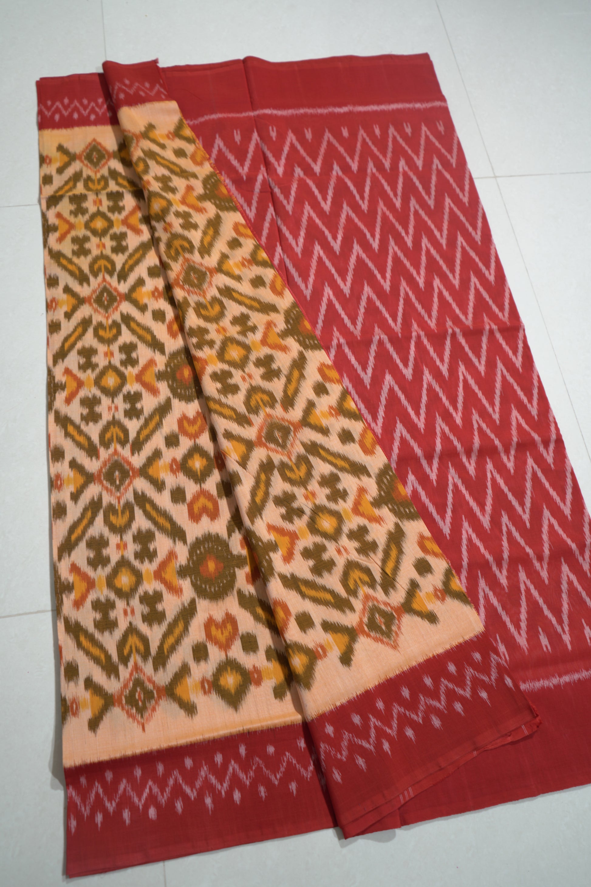 Each motif is crafted using the traditional resist-dyeing technique, where threads are meticulously tied and dyed before weaving — a process that demands patience, precision, and skill. The result is a saree that speaks of heritage, craftsmanship, and enduring beauty.