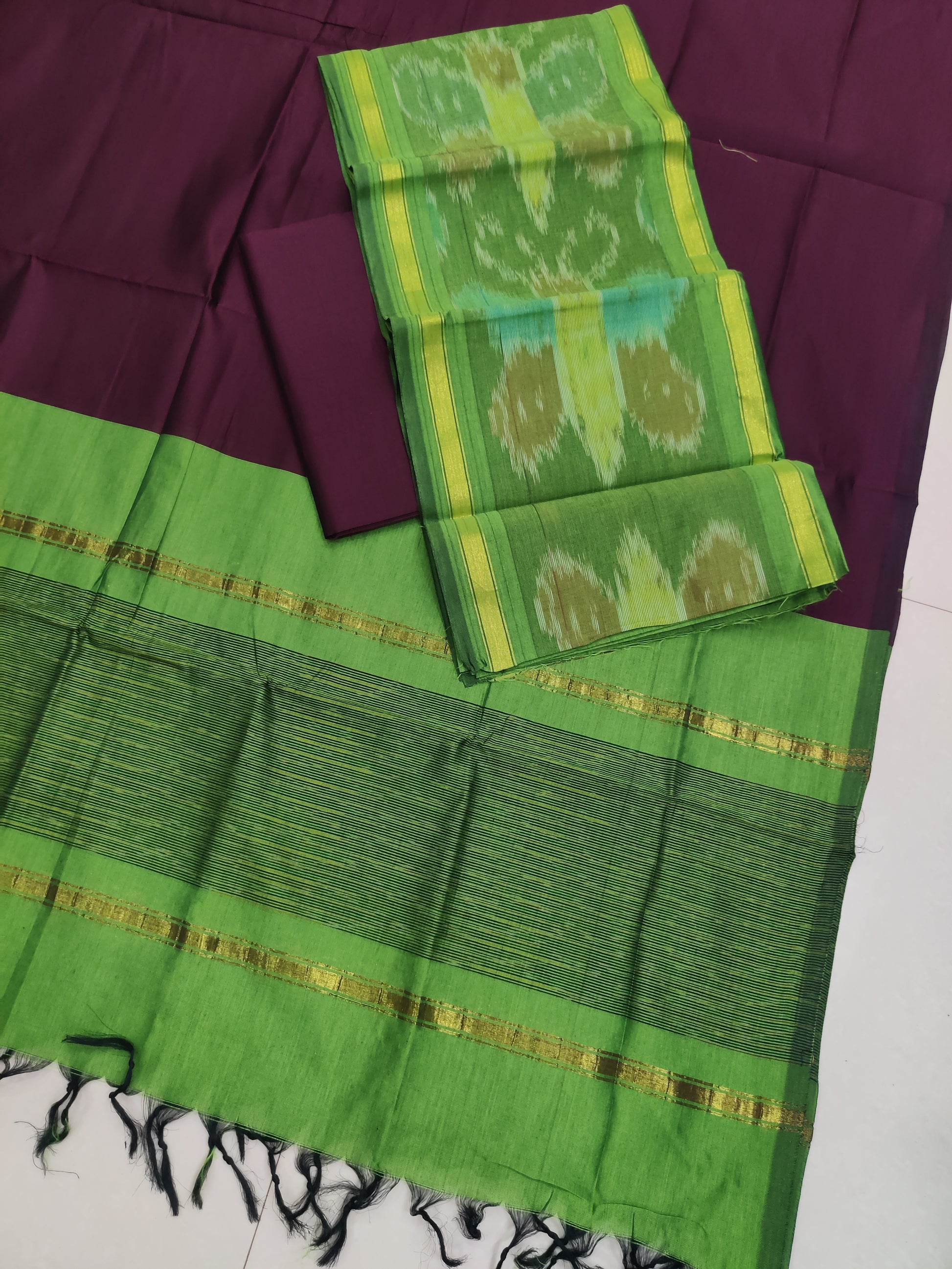 Green - 3PC HANDLOOM SILK COTTON POCHAMPALLY IKAT DRESS MATERIAL SET 03