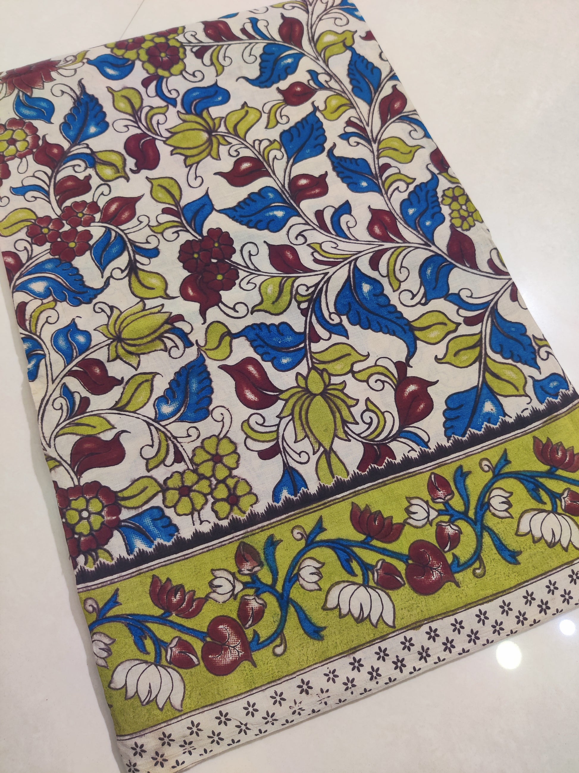 Is the Kalamkari design hand-painted or printed?