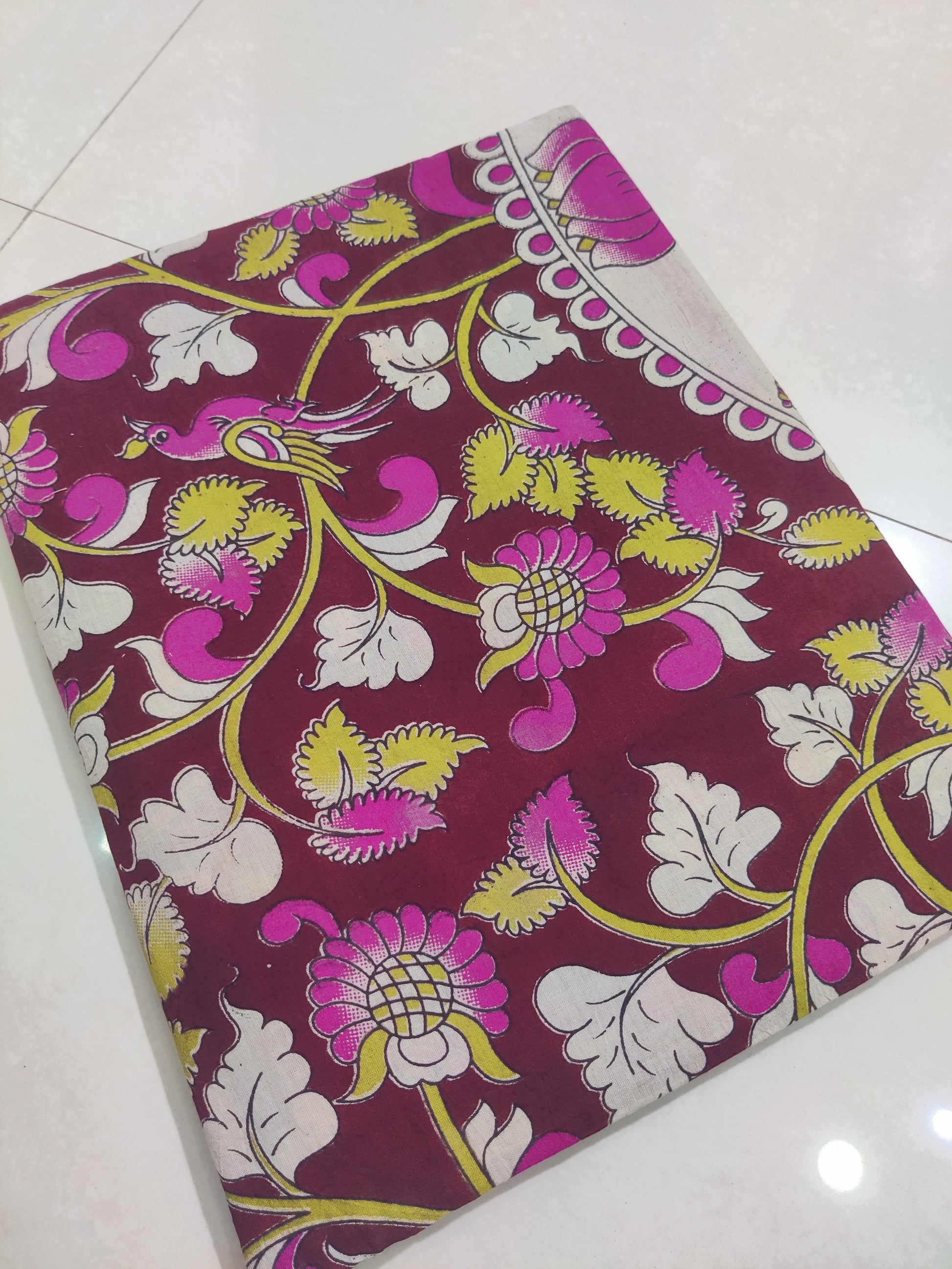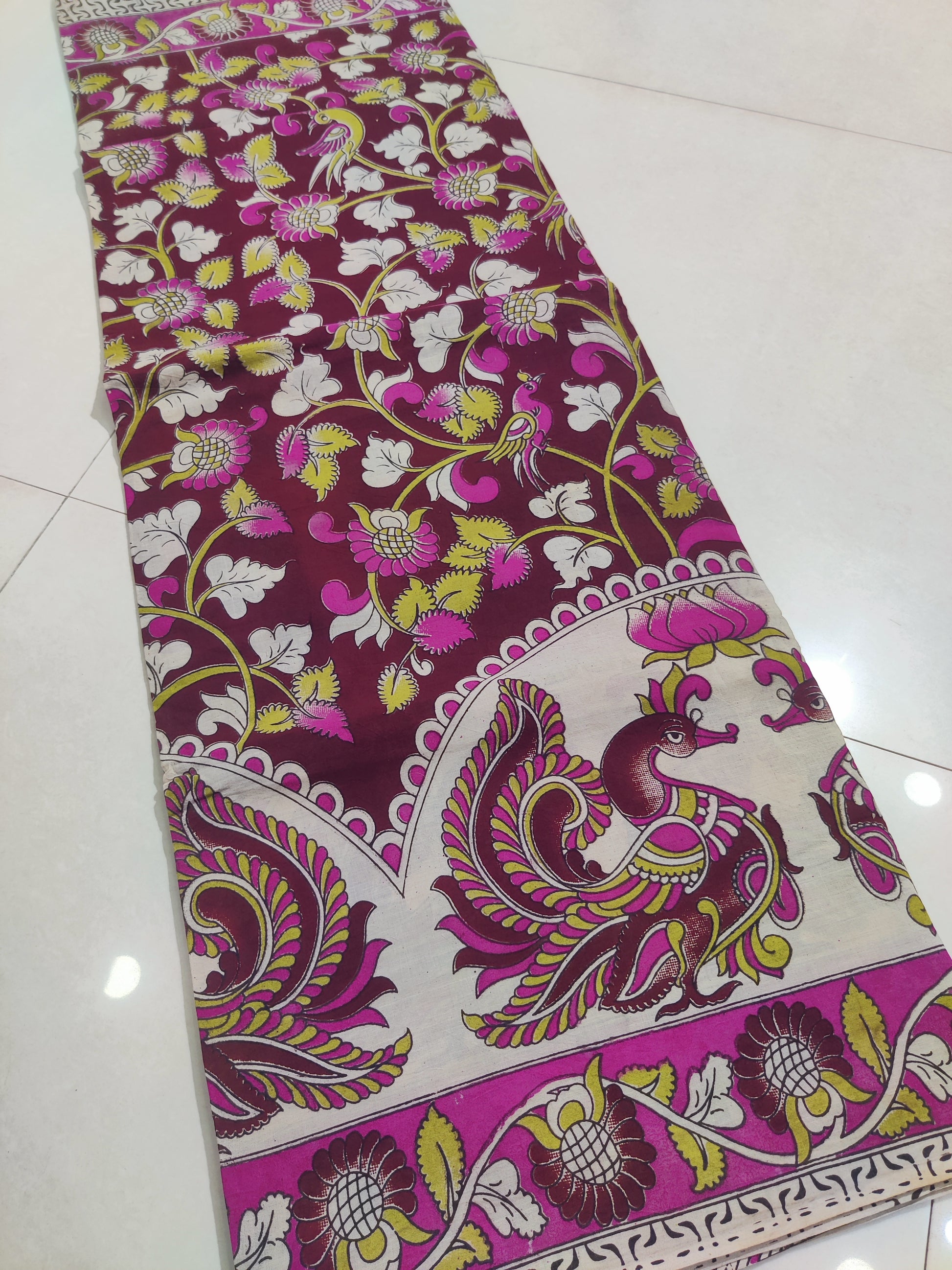 Is the Kalamkari design hand-painted or printed?
