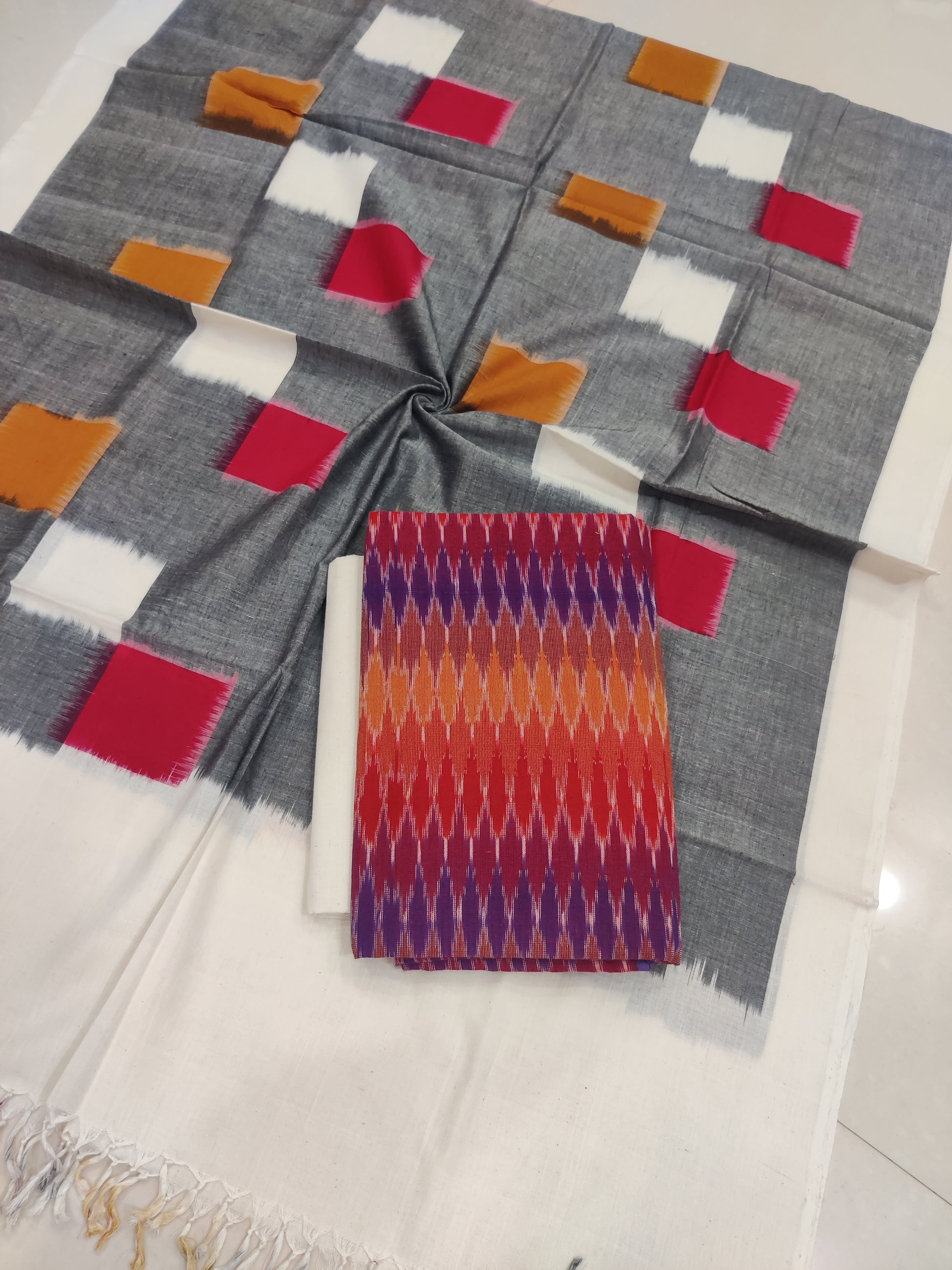 Gray - 3PC HANDLOOM POCHAMPALLY DOUBLE IKAT DUPATTA COTTON DRESS MATERIAL 25