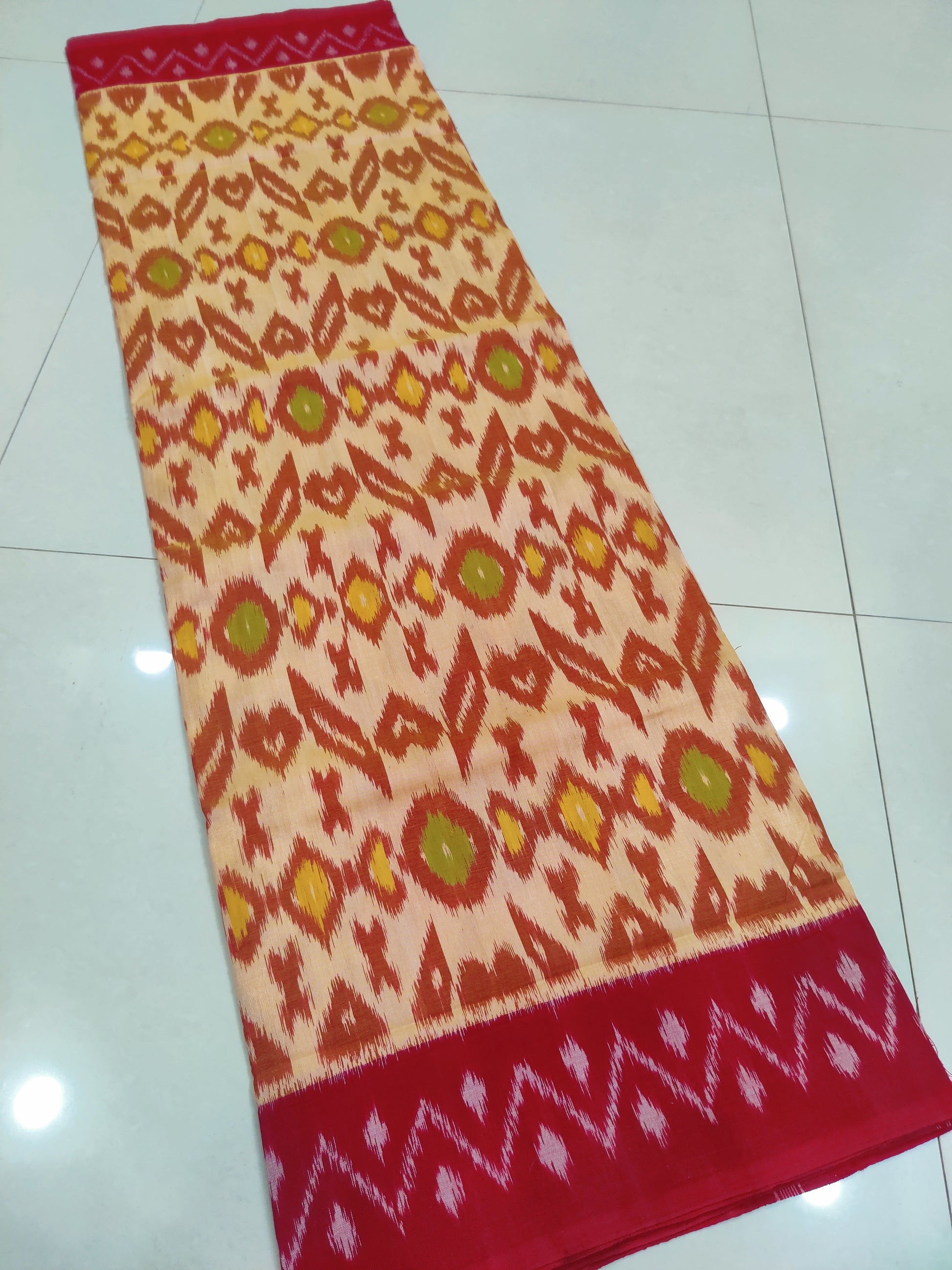 Each motif is crafted using the traditional resist-dyeing technique, where threads are meticulously tied and dyed before weaving — a process that demands patience, precision, and skill. The result is a saree that speaks of heritage, craftsmanship, and enduring beauty.