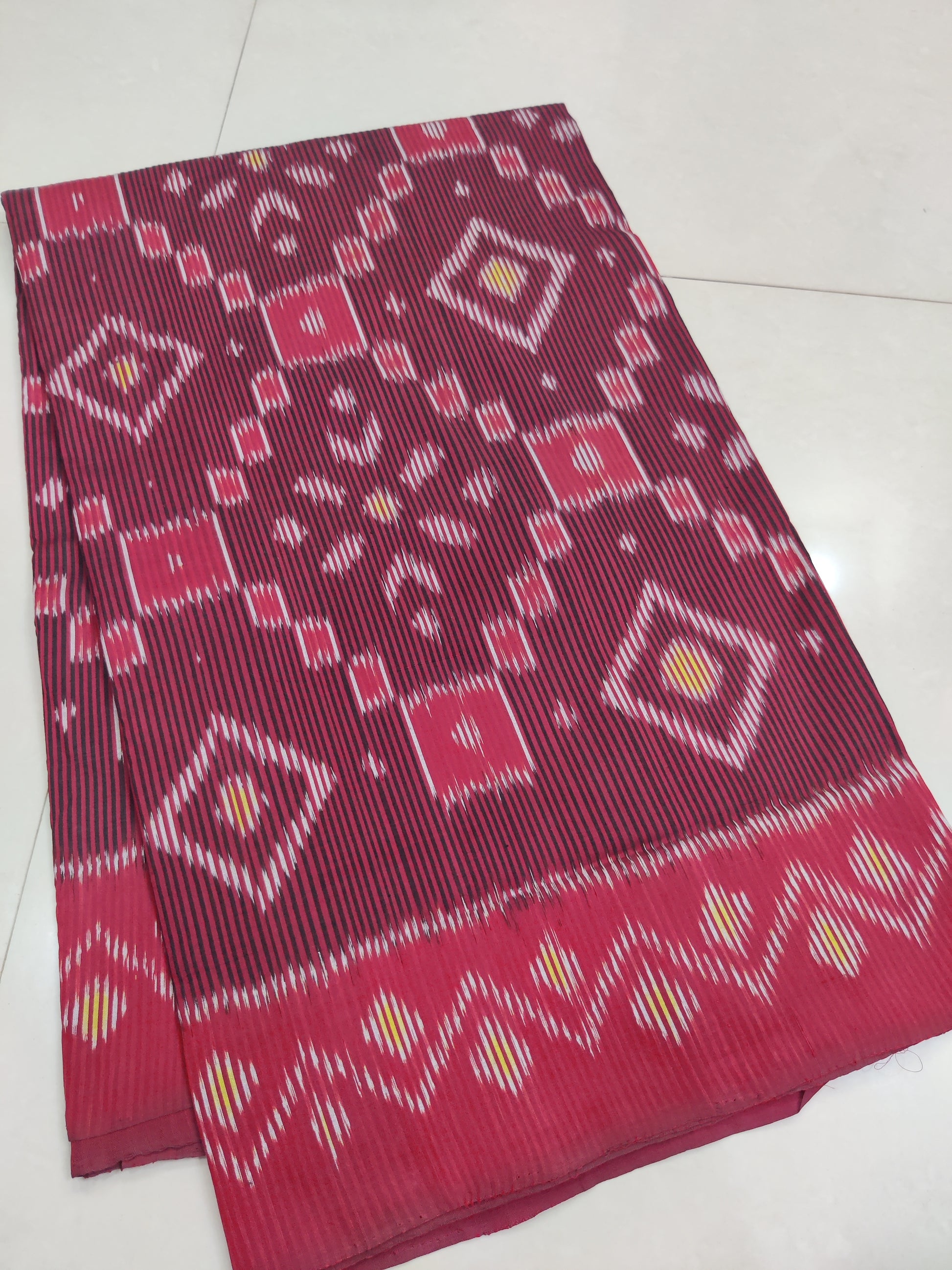 Each motif is crafted using the traditional resist-dyeing technique, where threads are meticulously tied and dyed before weaving — a process that demands patience, precision, and skill. The result is a saree that speaks of heritage, craftsmanship, and enduring beauty.