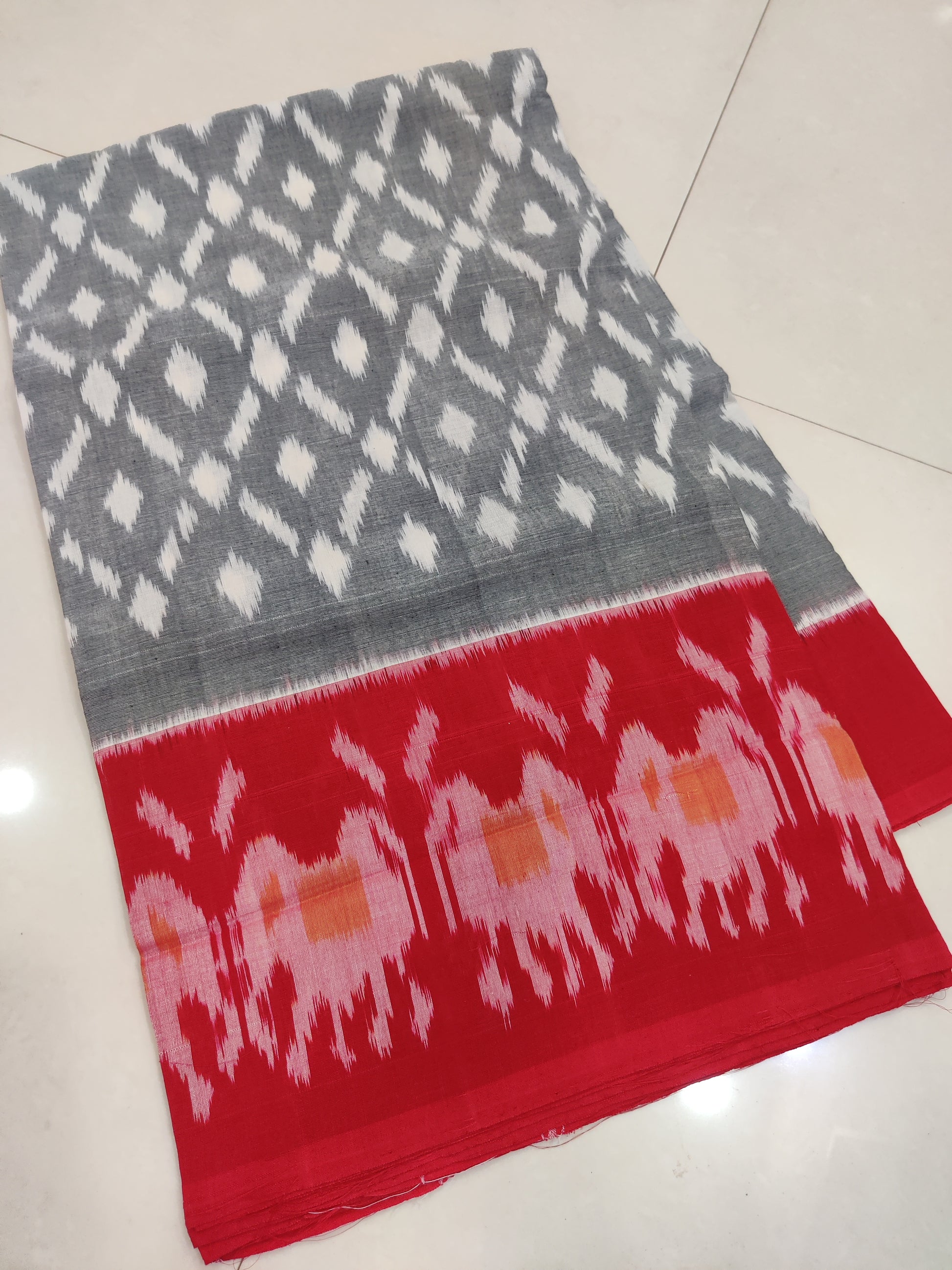 Each motif is crafted using the traditional resist-dyeing technique, where threads are meticulously tied and dyed before weaving — a process that demands patience, precision, and skill. The result is a saree that speaks of heritage, craftsmanship, and enduring beauty.