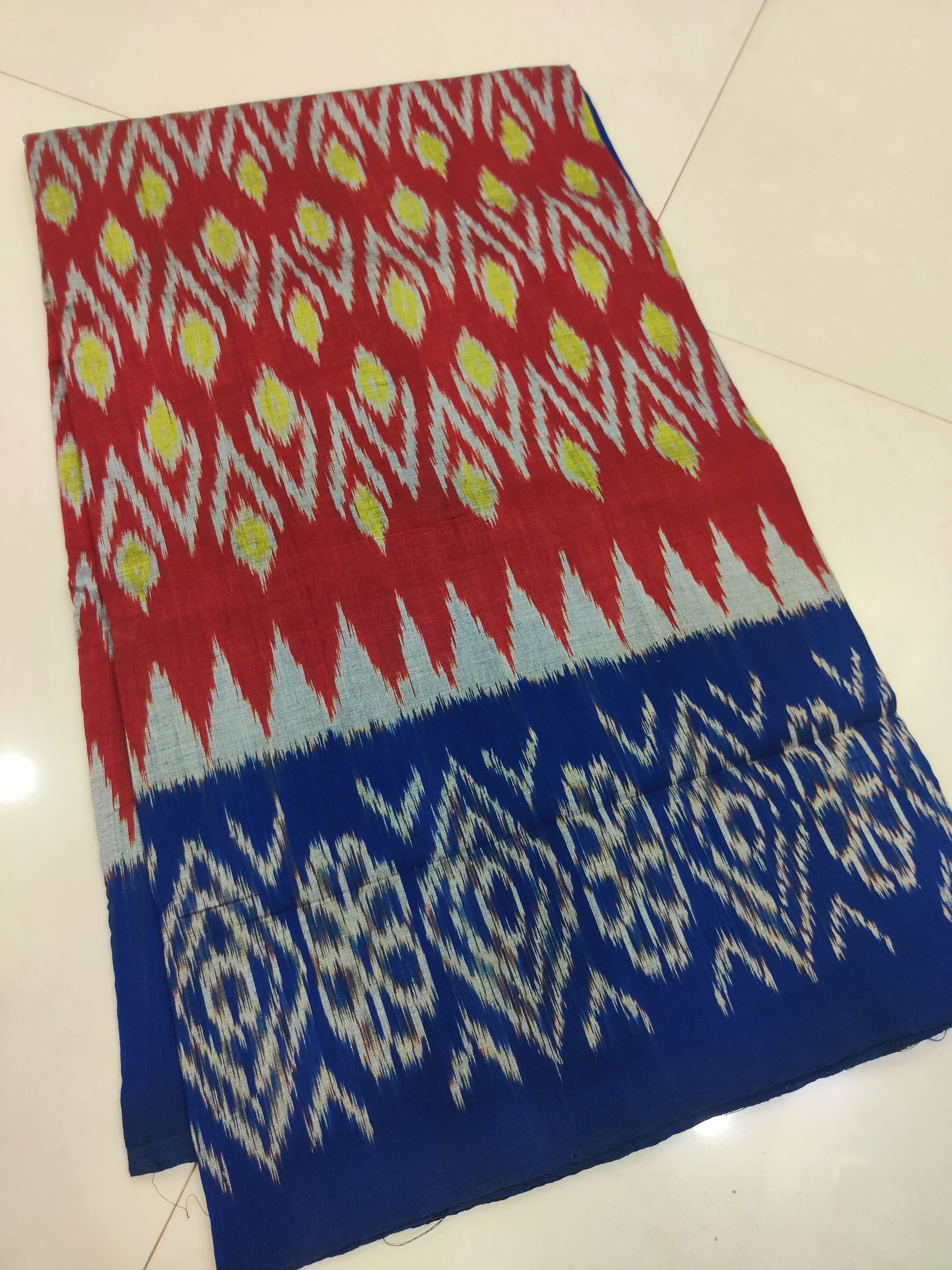 Each motif is crafted using the traditional resist-dyeing technique, where threads are meticulously tied and dyed before weaving — a process that demands patience, precision, and skill. The result is a saree that speaks of heritage, craftsmanship, and enduring beauty.