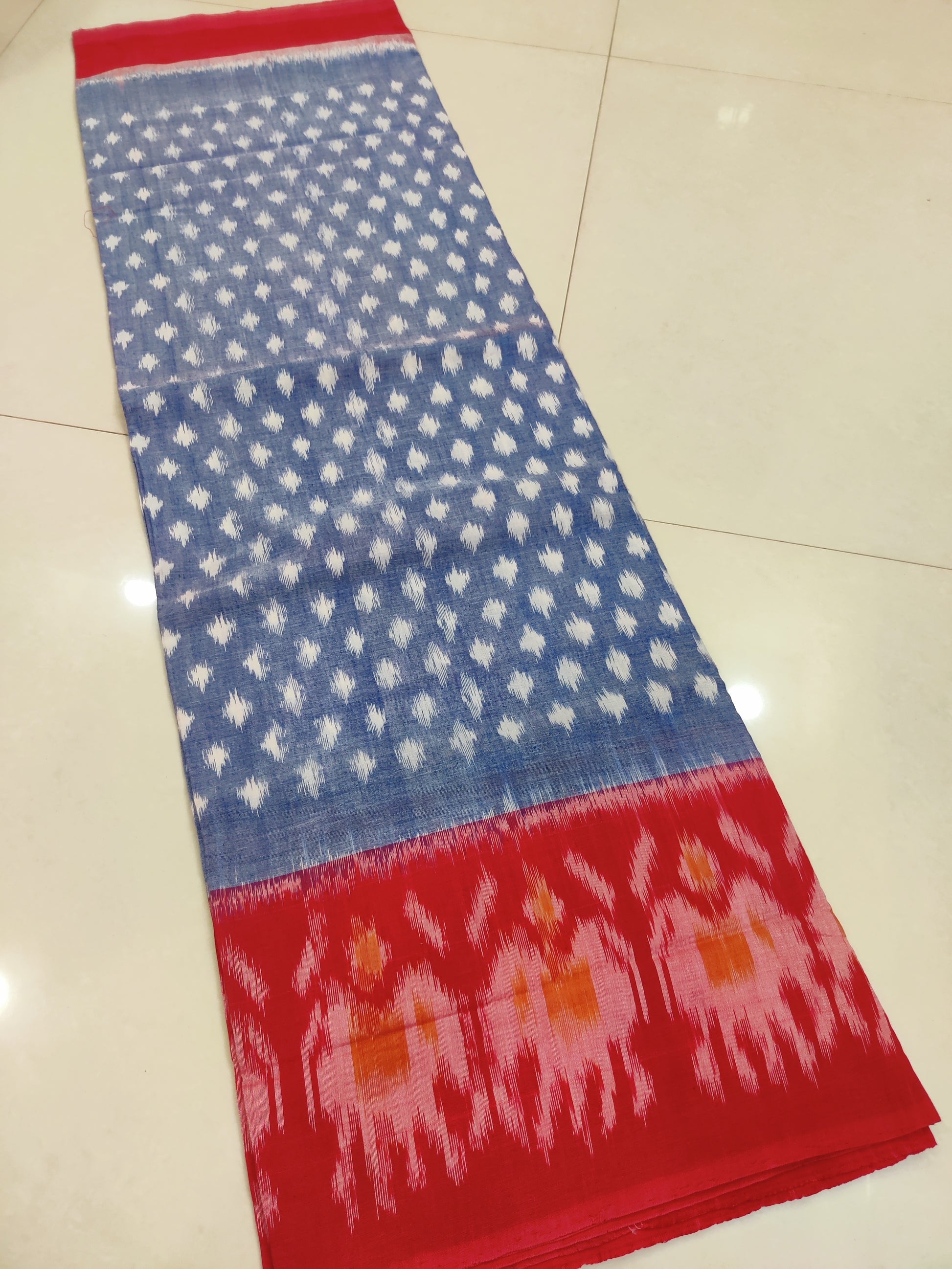 Each motif is crafted using the traditional resist-dyeing technique, where threads are meticulously tied and dyed before weaving — a process that demands patience, precision, and skill. The result is a saree that speaks of heritage, craftsmanship, and enduring beauty.