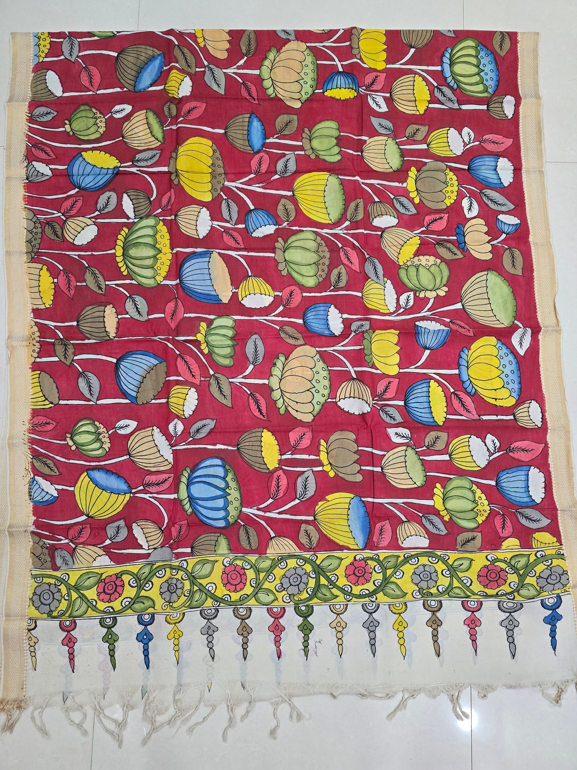 Every piece is 100% handpainted using natural colors, following the traditional Srikalahasti pen Kalamkari technique, where intricate motifs are created through freehand drawing with a pen, mastered by skilled artisans over generations.