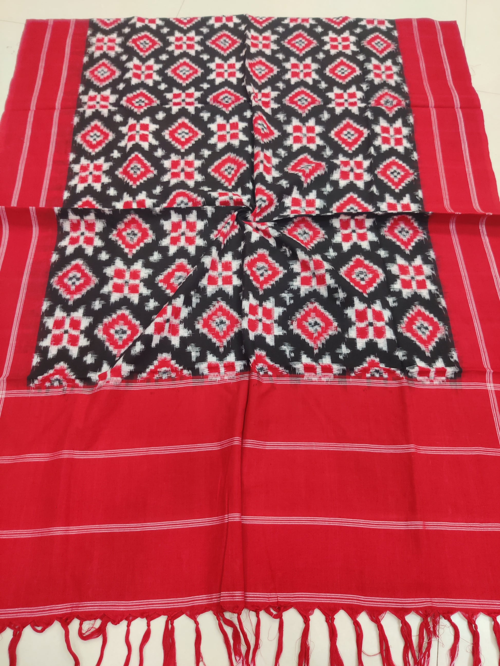 Immerse yourself in the artistry of Pochampally weaving with this exquisite Telia Rumal Double Ikat Cotton Handloom Dupatta. Each piece is meticulously handwoven using the ancient double ikat technique, where threads are resist-dyed before weaving to form intricate geometric patterns.